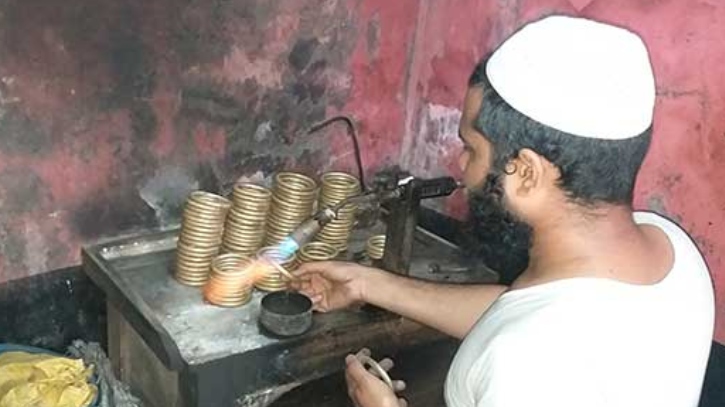 সকাল থেকে খট খট শব্দে মুখরিত হয় সাতক্ষীরার দেবহাটার পুরো গ্রামের পরিবেশ। কেউ ছোট হাতুড়ি দিয়ে পিতলের পাত পিটিয়ে বানাচ্ছেন গোলাকার পাইপ। আবার কেউ সেটিতে গালা ভরে তৈরি করছেন হাতের বালা। বাড়ি বাড়ি গিয়ে এসব বালা সংগ্রহ করেন পাইকাররা।