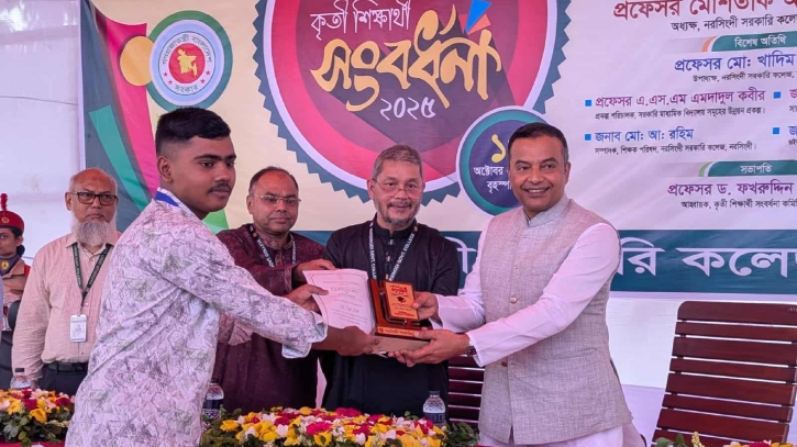 নরসিংদীতে প্রায় আড়াইশো কৃতি শিক্ষার্থীকে সংবর্ধনা দিয়েছে নরসিংদী সরকারি কলেজ কতৃপক্ষ। বৃহস্পতিবার (১৬ অক্টোবর) দুপুরে কলেজ মাঠে সংবর্ধনা অনুষ্ঠানের আয়োজন করা হয়। অনুষ্ঠানে ২০২৪ সালে এইচএসসি পাঁস করে বিভিন্ন পাবলিক বিশ্ববিদ্যালয়, মেডিকেল কলেজ ও প্রকৌশল বিশ্ববিদ্যালয়ে চান্সপ্রাপ্তদের হাতে সম্মাননা সনদ ও ক্রেস্ট তুলে দেন কলেজটির অধ্যক্ষ প্রফেসর মোশতাক আহমেদ ভূইয়া।