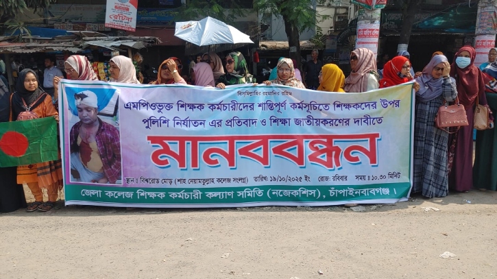 এমপিওভুক্ত শিক্ষক-কর্মচারীদের শান্তিপূর্ণ কর্মসূচিতে শিক্ষকদের উপর পুলিশি নির্যাতনের প্রতিবাদ এবং শিক্ষা জাতীয়করণের দাবিতে মানববন্ধন কর্মসূচি অনুষ্ঠিত হয়েছে চাঁপাইনবাবগঞ্জে। রবিবার (১৯ অক্টোবর) বেলা ১১টায় শহরের প্রবেশদ্বার বিশ্বরোড মোড় সংলগ্ন শাহনেয়ামতুল্লাহ ডিগ্রি কলেজের সামনে নবাবগঞ্জ জেলা কলেজ শিক্ষক কর্মচারী কল্যাণ সমিতি-নজেকশিকস এই মানববন্ধন কর্মসূচি আয়োজন করে।