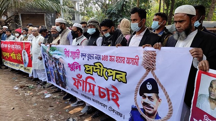 সোমবার (৩১ জানুয়ারি) সকাল ১০টা ২৫ মিনিটে কক্সবাজার জেলা ও দায়রা জজ আদালত চত্বরে টেকনাফের সর্বস্তরের জনগণের ব্যানারে ওই মানববন্ধন আয়োজন করা হয়। ব্যানারে লেখা হয়, ‘বন্দুক যুদ্ধের নামে ১৪৪ জনকে হত্যার আসামি ওসি প্রদীপের ফাঁসি চাই।’