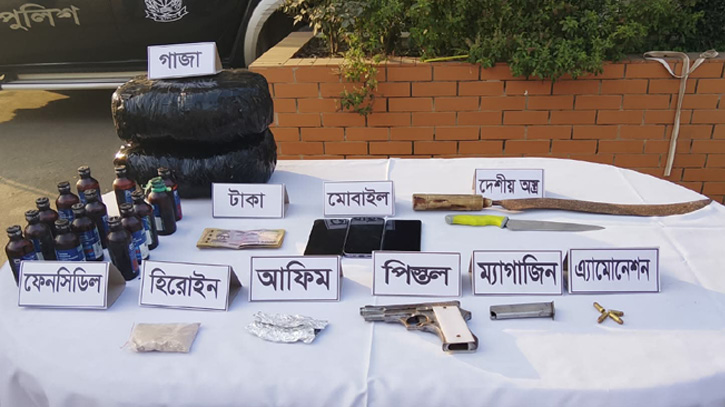এসময় ১ টি ৭.৬৫ মি.মি. টিটি-৩৩ অবৈধ পিস্তল, ১ টি ম্যাগাজিন, ৪ রাউন্ড পিস্তল এ্যামোনিশন, ৫ কেজি গাঁজা, ৫০ গ্রাম হিরোইন, ৫০ গ্রাম আফিম, ১৪ পিস ফেনসিডিল, ৮ টি মোবাইল, ২ টি দেশীয় ধারালো অস্ত্র এবং মাদক বিক্রয়ের নগদ ১৪,০০০ টাকা উদ্ধার করা হয়।