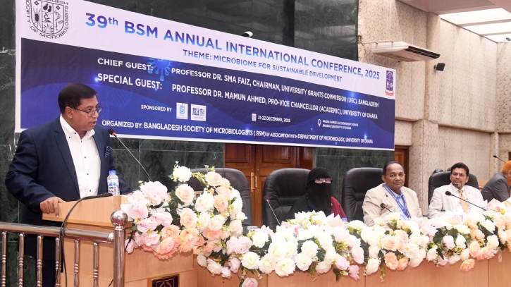 ঢাকা বিশ্ববিদ্যালয়ের নবাব নওয়াব আলী চৌধুরী সিনেট ভবনে অনুষ্ঠিত হয়েছে বাংলাদেশ সোসাইটি অব মাইক্রোবায়োলজিস্টস (বিএসএম)-এর ৩৯তম বার্ষিক আন্তর্জাতিক সম্মেলন। রবিবার (২১ ডিসেম্বর) এই সম্মেলন অনুষ্ঠিত হয়। ‘Microbiology for Sustainable Development’ শীর্ষক প্রতিপাদ্যে আয়োজিত এই সম্মেলনের উদ্বোধনী অনুষ্ঠানে মাইক্রোবায়োমভিত্তিক গবেষণার গুরুত্ব তুলে ধরেন ঢাকা বিশ্ববিদ্যালয়ের প্রো-ভাইস চ্যান্সেলর (শিক্ষা) অধ্যাপক ড. মামুন আহমেদ।