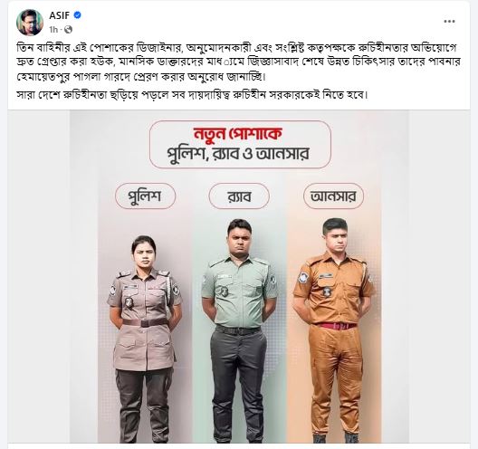 যেখানে তিনি পুলিশ, র্যাব ও আনসারের পোশাক পরিবর্তনের একটি ছবি পোস্ট করে লিখেছেন, তিন বাহিনীর এই পোশাকের ডিজাইনার, অনুমোদনকারী এবং সংশ্লিষ্ট কতৃপক্ষকে রুচিহীনতার অভিযোগে দ্রুত গ্রেপ্তার করা হোক।