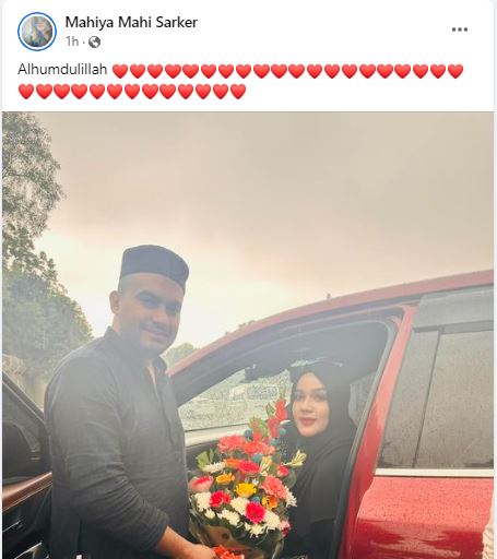 রাকিবকে ফুল দিয়ে বরণ করছেন মাহি; রবিবার সকালে ফেসবুকে এই ছবি পোস্ট করেন তিনি। ছবির ক্যাপশনে লিখেন আলহামদুলিল্লাহ। অসংখ্য লাভ সাইনও দিয়েছেন তিনি।