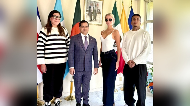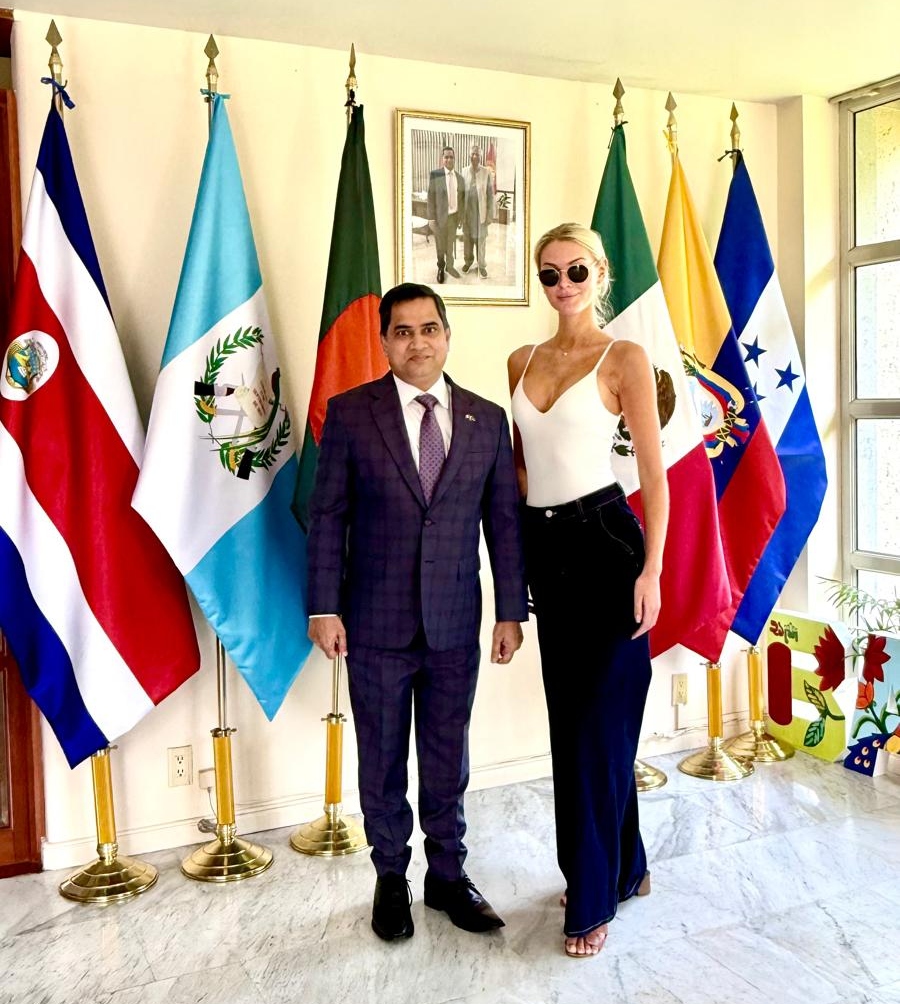 মেক্সিকো সফররত মিস ইউনিভার্স- ২০২৪ ভিক্টোরিয়া কিয়ার থেইলভিগ ও তার দল বাংলাদেশ দূতাবাসের রাষ্ট্রদূতের সঙ্গে সৌজন্য সাক্ষাৎ করেছেন। এ সময় তাদের স্বাগত জানান মেক্সিতে নিযুক্ত বাংলাদেশি রাষ্ট্রদূত মুশফিকুল ফজল আনসারী।