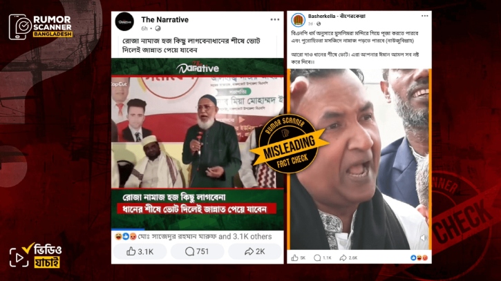 রিউমর স্ক্যানার টিমের অনুসন্ধানে জানা যায়, ‘ধানের শীষে ভোট দিলেই বেহেশতে যাওয়া যাবে’ এবং ‘ঢাকেশ্বরী মন্দিরে নামাজ পড়া ও বায়তুল মোকাররমে পূজা দেওয়া’ সংক্রান্ত বক্তব্য দুইটি সংশ্লিষ্ট বিএনপি নেতাদের নিজস্ব অভিমত নয়। প্রকৃতপক্ষে, ভিন্ন একটি রাজনৈতিক দলের কর্মকাণ্ডের সমালোচনার প্রেক্ষাপটে তারা এসব কথা উদাহরণ বা উদ্ধৃতি হিসেবে উল্লেখ করেন। তবে বক্তব্যের আগের ও পরের অংশ কাটছাঁট করে নির্দিষ্ট কয়েক সেকেন্ডের অংশ সামাজিক যোগাযোগমাধ্যমে প্রচার করা হচ্ছে।