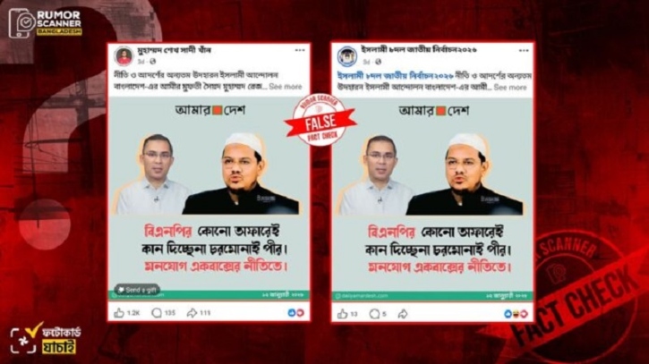 সম্প্রতি, ‘বিএনপির কোনো অফারেই কান দিচ্ছে না চরমোনাই পীর। মনযোগ একবাক্সের নীতিতে।’ শিরোনামে আমার দেশের ডিজাইন সংবলিত একটি ফটোকার্ড সামাজিক যোগাযোগ মাধ্যমে প্রচার করা হয়েছে। তবে, উক্ত ফটোকার্ডটি ভুয়া বলে জানিয়েছে রিউমর স্ক্যানার।