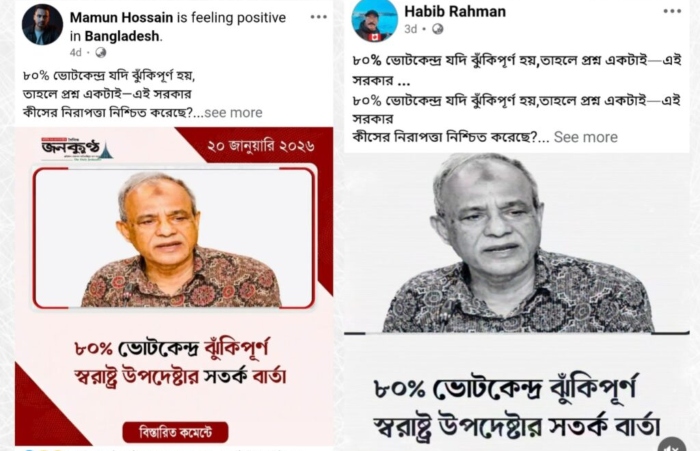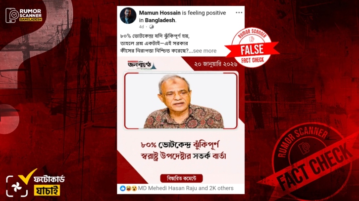 রিউমর স্ক্যানার টিমের অনুসন্ধানে জানা যায়, স্বরাষ্ট্র উপদেষ্টা জাহাঙ্গীর আলম চৌধুরী ৮০ শতাংশ ভোটকেন্দ্র ঝুঁকিপূর্ণ বলে মন্তব্য করেননি। প্রকৃতপক্ষে, কোনো নির্ভরযোগ্য তথ্যপ্রমাণ ছাড়াই ডিজিটাল প্রযুক্তির সহায়তায় জাতীয় দৈনিক পত্রিকা জনকণ্ঠের ফটোকার্ডের ডিজাইনের আদলে একটি ভুয়া ফটোকার্ড তৈরি করে তা প্রচার করা হয়েছে।