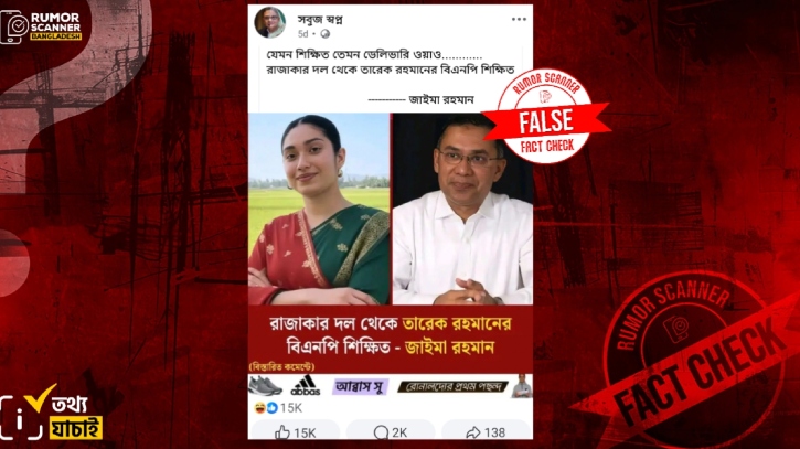 সম্প্রতি সামাজিক যোগাযোগমাধ্যমে বাংলাদেশ জাতীয়তাবাদী দল (বিএনপি) –এর চেয়ারম্যান তারেক রহমান এবং তার মেয়ে জাইমা রহমানের ছবি সংযুক্ত একটি ফটোকার্ড প্রচার করে দাবি করা হয়, জাইমা রহমান বলছেন, ‘রাজাকারের দল থেকে তারেক রহমানের বিএনপি শিক্ষিত।’