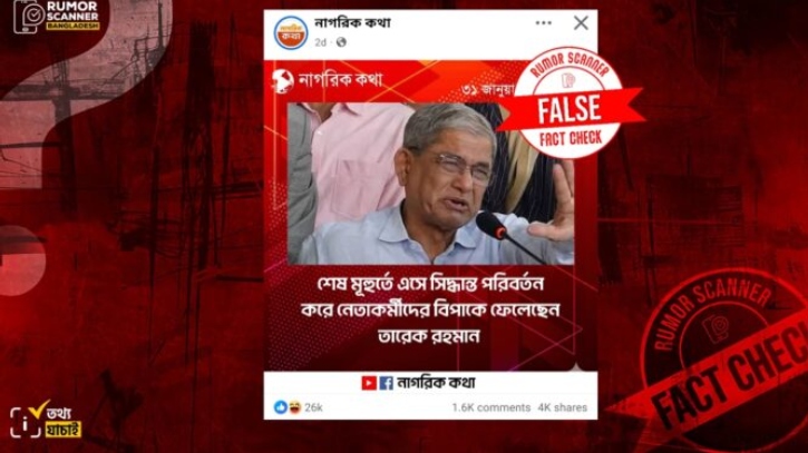 রিউমর স্ক্যানার টিমের অনুসন্ধানে জানা যায়, শেষ মুহূর্তে তারেক রহমানের সিদ্ধান্ত পরিবর্তন নেতাকর্মীদের বিপাকে ফেলেছে বলে মন্তব্য করেননি মির্জা ফখরুল। প্রকৃতপক্ষে, কোনো তথ্য প্রমাণ ছাড়াই উক্ত মন্তব্যটি তার নামে প্রচার করা হয়েছে।