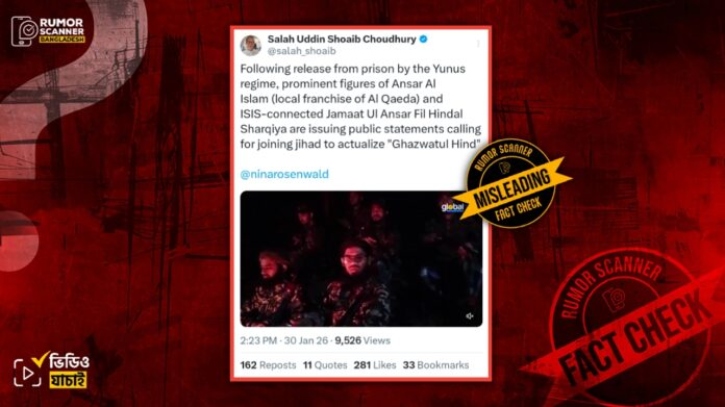 রিউমর স্ক্যানার টিমের অনুসন্ধানে দেখা যায়, আলোচিত ভিডিওটি জঙ্গিগোষ্ঠী আনসার আল ইসলাম এবং জামায়াতুল আনসার ফিল হিন্দাল আল শারক্বিয়ার নেতার সাম্প্রতিক সময়ে জিহাদের ডাক দিয়ে ভিডিও বার্তা প্রকাশের কোনো ঘটনার নয়। প্রকৃতপক্ষে, ২০২৩ সালে ‘জামায়াতুল আনসার ফিল হিন্দাল শারক্বিয়া’র আমির মো. আনিসুর রহমান মাহমুদ গ্রেফতারের ঘটনায় সে সময় প্রকাশিত প্রতিবেদনের অংশ কাটছাঁট করে আলোচিত দাবিতে প্রচার করা হয়েছে।