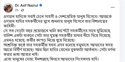 তিনি আরও লিখেছেন, হাদি গত দেড়টা বছর প্রয়োজনে খালি কার্পেটে সহকর্মীদের সাথে ঘুমিয়েছে, বালিশ একটা থাকলে সেটা তার ঘুমন্ত সহকর্মীর মাথার নীচে দিয়ে দিয়েছে; এমনও হয়েছে, কর্মীর কাপড় নিজে ধুয়ে দিয়েছে। অশ্রসিক্ত কণ্ঠে তার সহকর্মীরা যখন এসব বলেছে যমুনাতে, আমাদের হৃদয় আরো বিদীর্ণ হয়েছে। আর ছিল হাদির বোনের বুকফাটা আর্তনাদ। সেটা বর্ণনা করার ভাষা আমার নাই।