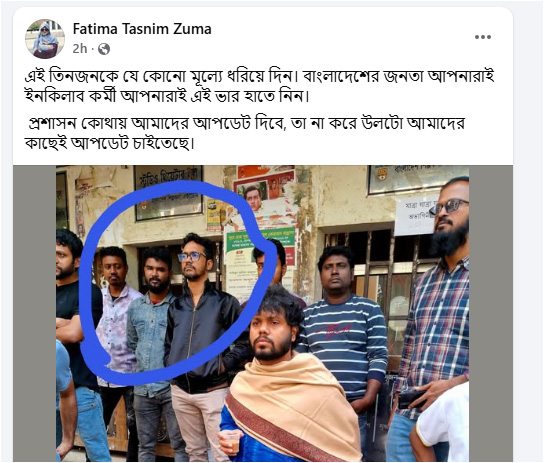 জুমা তিনজনকে ছবিতে চিহ্নিত করে তাদের ধরিয়ে দেওয়ার আহ্বান জানিয়ে জুমা বলেন, ‘এই তিনজনকে যেকোনো মূল্যে ধরিয়ে দিন। বাংলাদেশের জনতা আপনারাই ইনকিলাব কর্মী, আপনারাই এই ভার হাতে নিন। প্রশাসন কোথায় আমাদের আপডেট দিবে, তা না করে উলটো আমাদের কাছেই আপডেট চাইতেছে।’