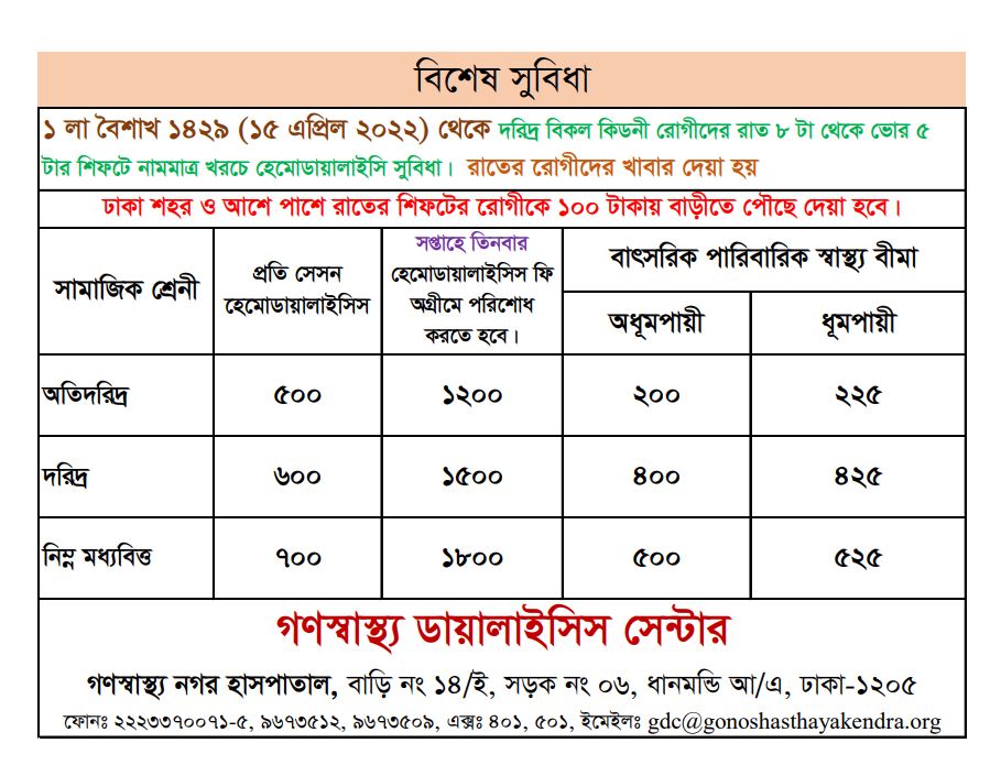 গণস্বাস্থ্য ডায়ালাইসিস সেন্টার এর পক্ষ থেকে গণমাধ্যমে পাঠানো এক প্রেস বিজ্ঞপ্তিতে জানানো হয়, এরই ধারাবাহিকতায়, ১লা বৈশাখ ১৪২৯ বঙ্গাব্দ, বুধবার (১৪ এপ্রিল) থেকে নতুন বছরে দরিদ্র বিকল