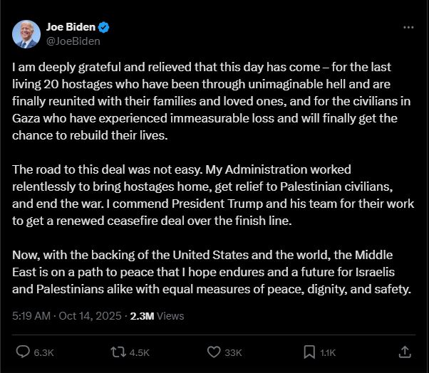 সামাজিক যোগাযোগমাধ্যম এক্সে বাইডেন লিখেন, আজকের দিনটি এসেছে, এ জন্য আমি গভীরভাবে কৃতজ্ঞ ও স্বস্তিবোধ করছি। শেষ পর্যন্ত জীবিত থাকা ২০ জন বন্দি, যারা অকল্পনীয় নরকযন্ত্রণার মধ্যে দিয়ে গেছেন, তারা অবশেষে তাদের পরিবার ও প্রিয়জনদের সঙ্গে পুনর্মিলিত হয়েছে। এবং গাজায় যারা অগণিত প্রাণহানি ও ক্ষয়ক্ষতির শিকার হয়েছেন এবং এখন অবশেষে তাদের জীবন পুনর্গঠনের সুযোগ পাচ্ছেন, তাদের জন্যও আমি আনন্দিত।