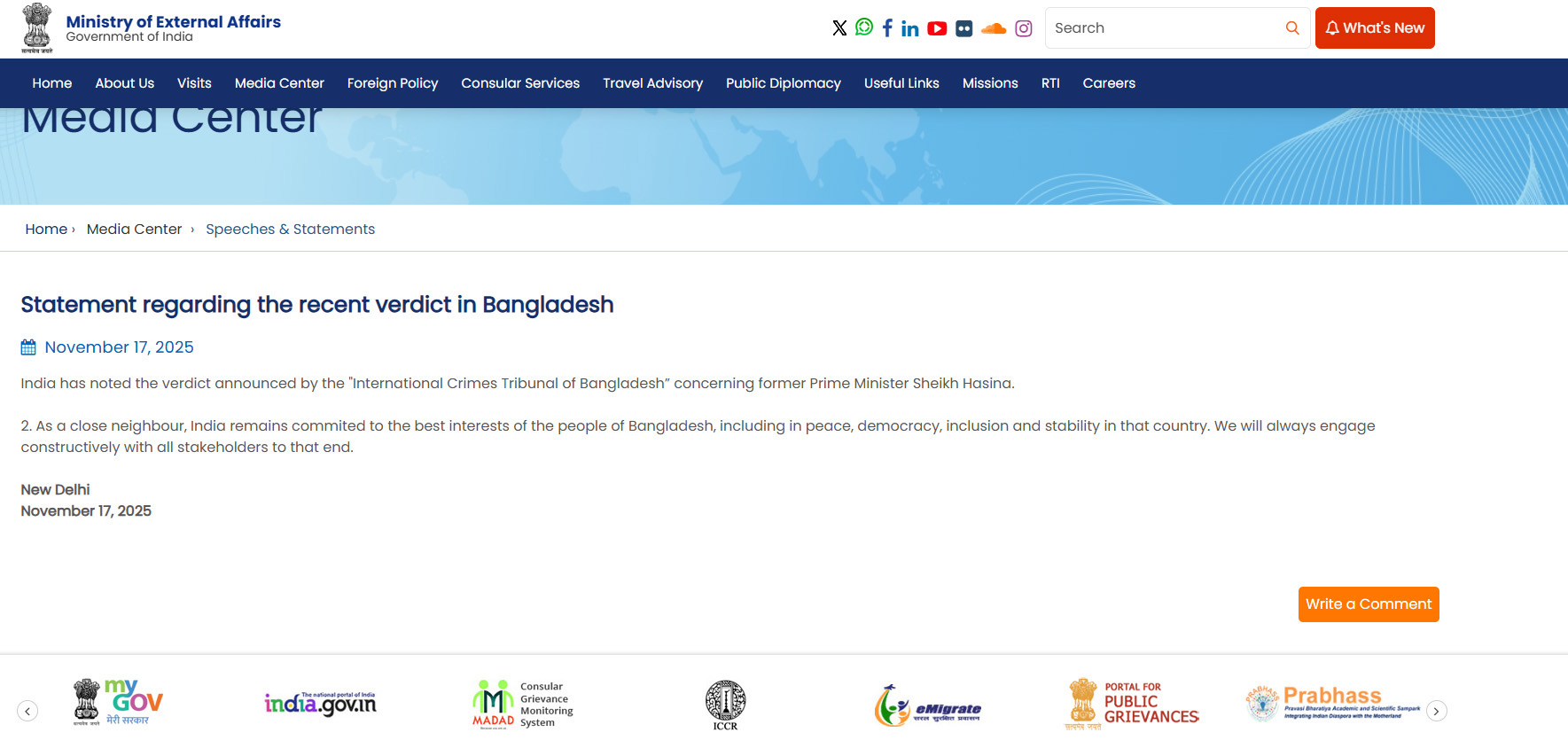 সোমবার (১৭ নভেম্বর) এক বিবৃতিতে দেশটির পররাষ্ট্র মন্ত্রণালয় জানায়, ভারত বাংলাদেশের ‘আন্তর্জাতিক অপরাধ ট্রাইব্যুনাল’ কর্তৃক সাবেক প্রধানমন্ত্রী শেখ হাসিনাকে ঘিরে ঘোষিত রায়টি সম্পর্কে অবগত আছে। নিকটতম প্রতিবেশী হিসেবে ভারত বাংলাদেশের জনগণের সর্বোত্তম স্বার্থের প্রতি প্রতিশ্রুতিবদ্ধ, যার মধ্যে রয়েছে ওই দেশের শান্তি, গণতন্ত্র, অন্তর্ভুক্তি এবং স্থিতিশীলতা।