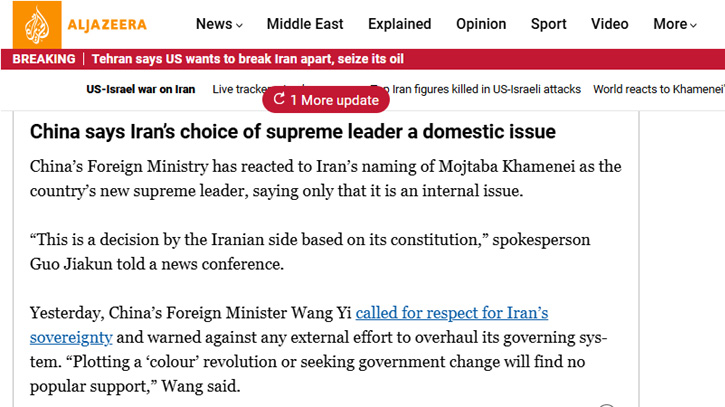 মোজতবা খামেনিকে ইরানের নতুন সর্বোচ্চ নেতা হিসেবে মনোনয়ন দেওয়া সম্পূর্ণই দেশটির অভ্যন্তরীণ বিষয় বলে মন্তব্য করেছে চীন। চীনের পররাষ্ট্র মন্ত্রণালয়ের মুখপাত্র গুও জিয়াকুন এক সংবাদ সম্মেলনে বলেন, ‘এটি ইরানের সংবিধান অনুযায়ী ইরানের নিজের সিদ্ধান্ত।’