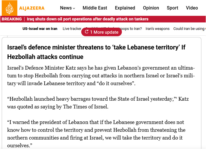 দীর্ঘদিন ধরে ফিলিস্তিনের গাজা ও জেরুজালেম দখলে রেখেছে ইহুদিবাদ রাষ্ট্র ইসরাইল। এর মধ্যে নতুন আরেক মধ্যপ্রাচ্যের আরেক দেশ লেবানন দখল করে নেওয়ার হুমকি দিয়েছেন দেশটির প্রতিরক্ষামন্ত্রী ইসরায়েল কাৎজ। কাতারভিত্তিক গণমাধ্যম আল জাজিরা এক প্রতিবেদনে এই তথ্য জানিয়েছে।
