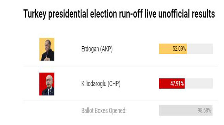 আনাদোলু এজেন্সি বলেছে, ৯৭ শতাংশ ভোট গণনা সম্পন্ন হয়েছে। এর মধ্যে এরদোয়ান ৫২ দশমিক ১ শতাংশ পেয়ে জয় লাভ করেছেন। অন্যদিকে তার প্রতিদ্বন্দ্বী প্রার্থী কেমাল কিলিচদারোগলু পেয়েছেন ৪৭ দশমিক ৯ শতাংশ।