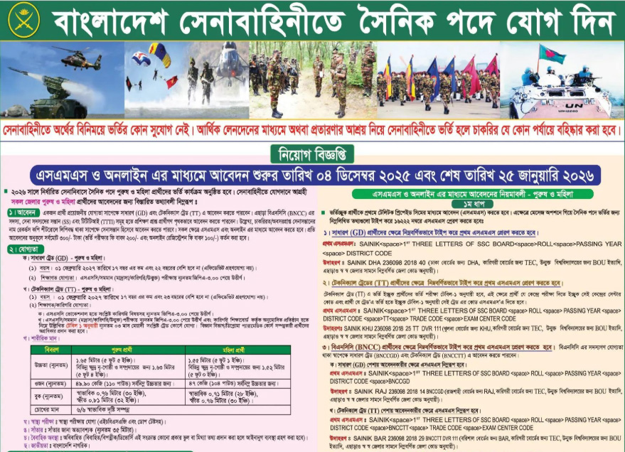 বাংলাদেশ সেনাবাহিনীতে নিয়োগ বিজ্ঞপ্তি প্রকাশ হয়েছে। ‘সৈনিক’ পদে জনবল নেবে সেনাবাহিনী। সাধারণ (জিডি) এবং টেকনিক্যাল ট্রেড (টিটি) বিভাগে নারী-পুরুষ নিয়োগ করা হবে।