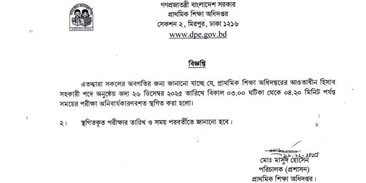 বিজ্ঞপ্তিতে বলা হয়েছে, প্রাথমিক শিক্ষা অধিদফতরের আওতাধীন হিসাব সহকারী পদে অনুষ্ঠেয় আজ বিকাল ৩টা থেকে ৪টা ২০মিনিট পর্যন্ত সময়ের পরীক্ষা অনিবার্যকারণবশত স্থগিত করা হলো।