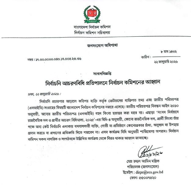 এতে বলা হয়েছে, নির্বাচনী প্রচারণার আড়ালে কতিপয় ব্যক্তি কর্তৃক ভোটারদের ব্যক্তিগত তথ্য এবং জাতীয় পরিচয়পত্র (এনআইডি) সংগ্রহের বিষয়টি বাংলাদেশ নির্বাচন কমিশনের নজরে এসেছে। জাতীয় পরিচয়পত্র নিবন্ধন আইন ২০১০ অনুযায়ী, অন্যের জাতীয় পরিচয়পত্র (এনআইডি) বহন কিংবা হস্তান্তর করা যাবে না।