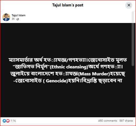 পোস্টে তিনি লেখেন, ম্যাসমার্ডার ( Mass murder) মানে গণহত্যা, জেনোসাইড ( Genocide) মানে জাতিগত নির্মূল। জুলাইয়ে বাংলাদেশে গণহত্যা ( Mass Murder) হয়েছে- জেনোসাইড ( Genocide) হয়নি। বিভ্রান্তি ছড়াবেন না।
