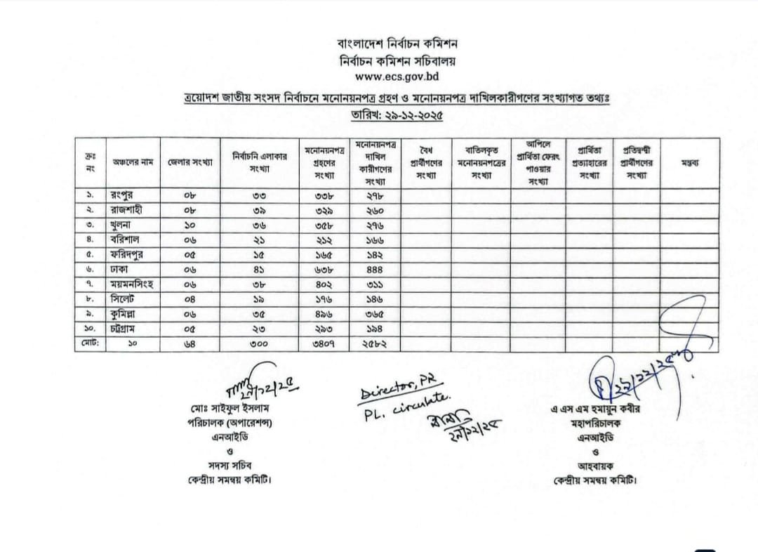 কুমিল্লা অঞ্চলে ৪৯৬জন মনোনয়ন ফরম তুললেও জমা দিয়েছেন ৩৬৫ জন। রংপুরে ৩৩৮জন ফরম তুলে মনোনয়নপত্র দাখিল করেছেন ২৭৮ জন। রাজশাহীতে ৩২৯ জন মনোনয়নপত্র তুললেও দাখিল করেছেন ২৬০।