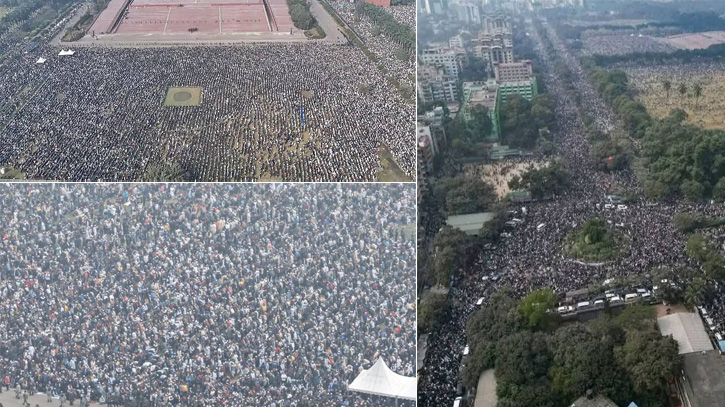 অন্যদিকে, সংসদ ভবনের দক্ষিণ প্লাজার দুটি মাঠের মোট আয়তন প্রায় ৮৭ হাজার ৬৩৬ বর্গমিটার। সেখানে প্রতি বর্গমিটারে গড়ে ৬ জন করে ধরলে প্রায় ৫ লাখ ২৫ হাজার মানুষ জানাজায় অংশ নেওয়ার সুযোগ পান। সব মিলিয়ে রাস্তা ও মাঠে মোট প্রায় ৪ লাখ বর্গমিটার এলাকায় জানাজা অনুষ্ঠিত হয়েছে।
