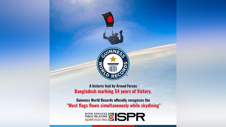 বিজয়ের মাসে বাংলাদেশ পেল এক অনন্য আন্তর্জাতিক সম্মান। গিনেস ওয়ার্ল্ড রেকর্ডস কর্তৃপক্ষ আনুষ্ঠানিকভাবে নিশ্চিত করেছে যে, ১৬ ডিসেম্বর ২০২৫, মহান বিজয় দিবসে ঢাকায় অনুষ্ঠিত একটি বিশেষ প্যারাশুট জাম্প অভিযানের মাধ্যমে বাংলাদেশ একসঙ্গে সর্বাধিক ৫৪টি জাতীয় পতাকা উত্তোলনের বিশ্বরেকর্ড গড়েছে। মঙ্গলবার (১৩ জানুয়ারি) আন্তঃবাহিনী জনসংযোগ পরিদফতরের (আইএসপিআর) পাঠানো এক সংবাদ বিজ্ঞপ্তিতে এই অর্জনের কথা জানানো হয়।