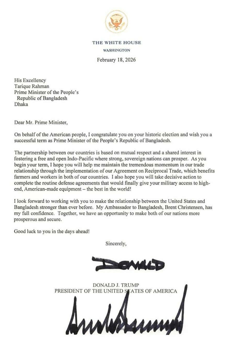 তারেক রহমানকে লেখা চিঠিতে ট্রাম্প আরও বলেন, বাণিজ্য চুক্তি কার্যকর করার মাধ্যমে দুই দেশের সম্পর্কের গতিশীলতা বৃদ্ধি পাবে, যা কৃষক ও শ্রমিকদের জন্যও উপকারী হবে। তিনি আশাবাদ ব্যক্ত করেন যে, প্রতিরক্ষা চুক্তি সম্পাদনের জন্য কার্যকর পদক্ষেপ নেওয়া হবে, ফলে সামরিক বাহিনীর হাতে পৌঁছাবে বিশ্বের মান অনুযায়ী সর্বোত্তম আমেরিকান-তৈরি সরঞ্জাম।
