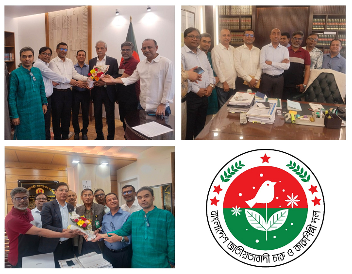 বাংলাদেশ জাতীয়তাবাদী চারু ও কারুশিল্পী দলের নেতৃবৃন্দ ও উপদেষ্টামণ্ডলী আজ সংস্কৃতিমন্ত্রী নিতাই রায় চৌধুরী, আইন, বিচার ও সংসদ বিষয়ক মন্ত্রী মো. আসাদুজ্জামান এবং বেসামরিক বিমান পরিবহন ও পর্যটন প্রতিমন্ত্রী এম রশিদুজ্জামান মিল্লাতের সঙ্গে সৌজন্য সাক্ষাৎ করেছেন।