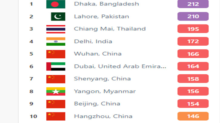 এ ছাড়া একইসময়ে একিউআই স্কোর ১৬৪ নিয়ে ষষ্ঠ স্থানে রয়েছে সংযুক্ত আরব আমিরাতের দুবাই। ১৫৬ স্কোর নিয়ে সপ্তম স্থানে রয়েছে মায়ানমারের ইয়াঙ্গুন। ১৫৬ স্কোর নিয়ে অষ্টম স্থানে রয়েছে তাইওয়ানের কাওশিউং। ১৫৬ স্কোর নিয়ে নবম স্থানে রয়েছে মঙ্গোলিয়ার উলানবাটার। ১৫৪ স্কোর নিয়ে দশম স্থানে রয়েছে চীনের শেনিয়াং।