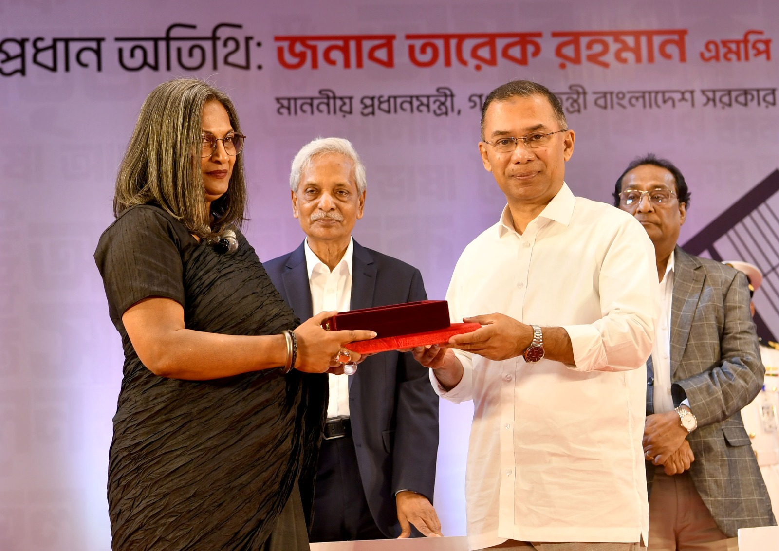 প্রধানমন্ত্রী তারেক রহমানের হাত থেকে স্থাপত্যে একুশে পদক নিলেন মেরিনা তাবাসসুম।