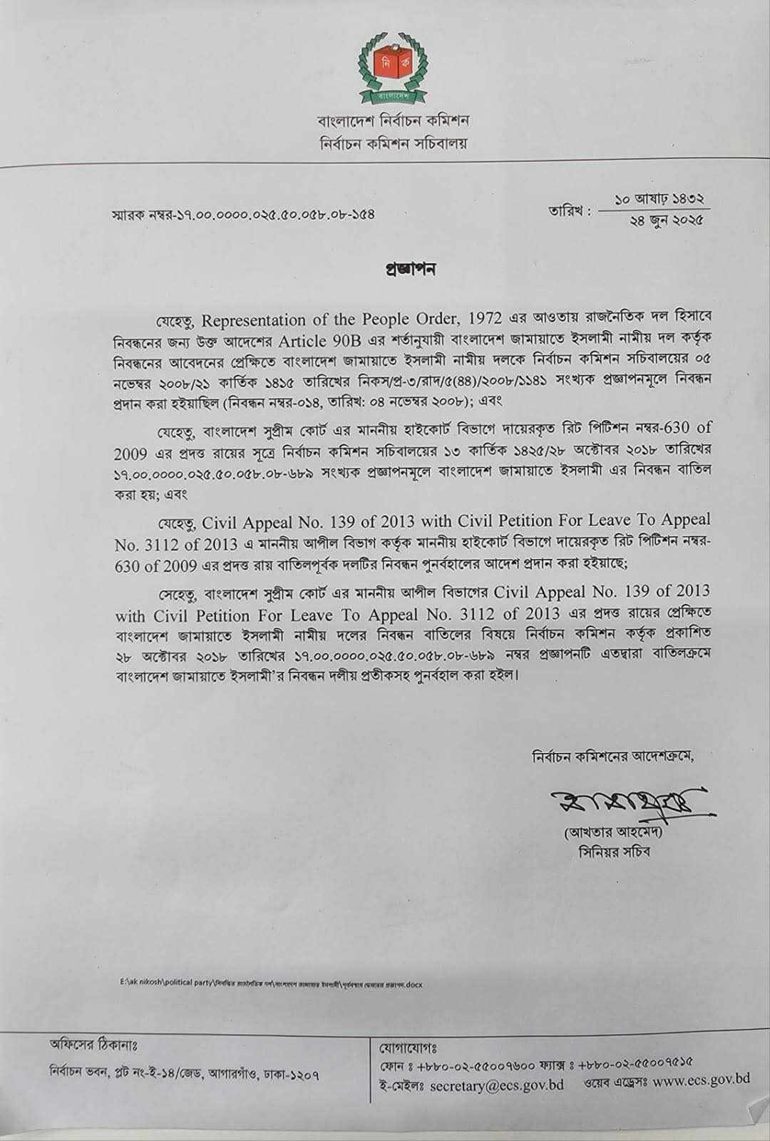 প্রজ্ঞাপনে বলা হয়েছে, যেহেতু, Representation of the People Order, 1972 এর আওতায় রাজনৈতিক দল হিসাবে নিবন্ধনের জন্য উক্ত আদেশের Article 90B এর শর্তানুযায়ী বাংলাদেশ জামায়াতে ইসলামী নামীয় দল কর্তৃক নিবন্ধনের আবেদনের প্রেক্ষিতে বাংলাদেশ জামায়াতে ইসলামী নামীয় দলকে নির্বাচন কমিশন সচিবালয়ের ০৫ নভেম্বর ২০০৮/২১ কার্তিক ১৪১৫ তারিখের নিকস/প্র-৩/রাদ/৫(৪৪)/২০০৮/১১৪১ সংখ্যক প্রজ্ঞাপনমূলে নিবন্ধন প্রদান করা হইয়াছিল (নিবন্ধন নম্বর-০১৪, তারিখ: ০৪ নভেম্বর ২০০৮); এবং যেহেতু, বাংলাদেশ সুপ্রীম কোর্ট এর মাননীয় হাইকোর্ট বিভাগে দায়েরকৃত রিট পিটিশন নম্বর-630 of 2009 এর প্রদত্ত রায়ের সূত্রে নির্বাচন কমিশন সচিবালয়ের ১৩ কার্তিক ১৪২৫/২৮ অক্টোবর ২০১৮ তারিখের ১৭.০০.০০০০.০২৫.৫০.০৫৮.০৮-৬৮৯ সংখ্যক প্রজ্ঞাপনমূলে বাংলাদেশ জামায়াতে ইসলামী এর নিবন্ধন বাতিল করা হয়; এবং যেহেতু, Civil Appeal No. 139 of 2013 with Civil Petition For Leave To Appeal No. 3112 of 2013 এ মাননীয় আপীল বিভাগ কর্তৃক মাননীয় হাইকোর্ট বিভাগে দায়েরকৃত রিট পিটিশন নম্বর-630 of 2009 এর প্রদত্ত রায় বাতিলপূর্বক দলটির নিবন্ধন পুনর্বহালের আদেশ প্রদান করা হইয়াছে।