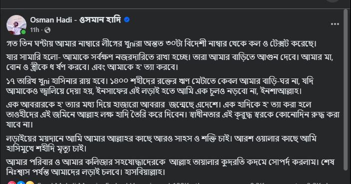 শুক্রবার (১৪ নভেম্বর) সকালে দেওয়া ফেসবুক পোস্টে ওসমান হাদি লিখেন, গত তিন ঘণ্টায় আমার নম্বরে আওয়ামী লীগের খুনিরা অন্তত ৩০টা বিদেশি নম্বর থেকে কল ও টেক্সট করেছে। যার সামারি হলো- আমাকে সর্বক্ষণ নজরদারিতে রাখা হচ্ছে। তারা আমার বাড়িতে আগুন দেবে। আমার মা, বোন ও স্ত্রীকে ধর্ষণ করবে এবং আমাকে হত্যা করবে।