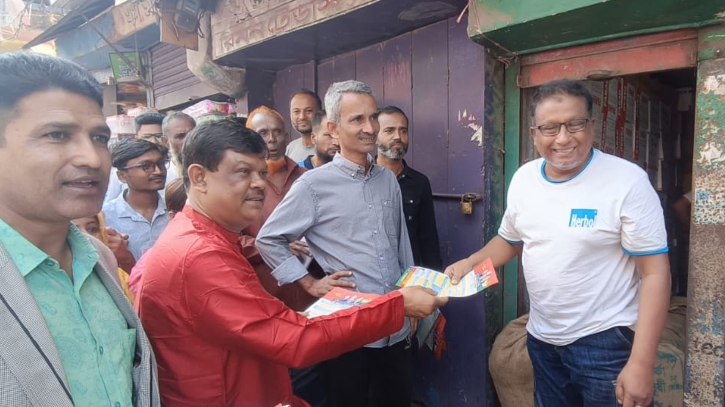 ছবি: লিফলেট বিতরণ করছেন আবু নাসের মুহাম্মদ রহমাতুল্লাহ