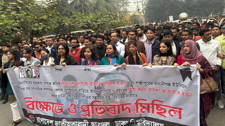রবিবার (২১ ডিসেম্বর) দুপুরে ঢাকা বিশ্ববিদ্যালয়ের রাজু ভাস্কর্যে দীপু চন্দ্র দাস ও শিশু আয়েশা হত্যাসহ দেশব্যাপী মব সন্ত্রাসের বিচার দাবিতে আয়োজিত বিক্ষোভ ও প্রতিবাদ মিছিল-পরবর্তী সমাবেশে এসব কথা বলেন তিনি।