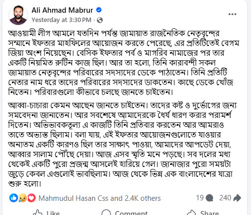 আলী আহমদ মাবরুর তার ফেসবুক পোস্টে লিখেন, ‘আওয়ামী লীগ আমলে যতদিন পর্যন্ত জামায়াত রাজনৈতিক নেতৃবৃন্দের সম্মানে ইফতার মাহফিলের আয়োজন করতে পেরেছে, এর প্রতিটিতেই বেগম জিয়া অংশ নিয়েছেন। বেসিক ইফতার পর্ব ও মাগরিব নামাজের পর তার একটি নিয়মিত রুটিন কাজ ছিল। আর তা হলো, তিনি কারাবন্দী সকল জামায়াত নেতৃবৃন্দের পরিবারের সদস্যদের ডেকে পাঠাতেন। তিনি প্রতিটি নেতার নাম ধরে তাদের পরিবারের সদস্যদের ডাকতেন। কাছে ডেকে খোঁজ নিতেন। পরিবারগুলো কীভাবে চলছে জানতে চাইতেন। আব্বা-চাচারা কেমন আছেন জানতে চাইতেন। তাদের কষ্ট ও দুর্ভোগের জন্য সমবেদনা জানাতেন।
