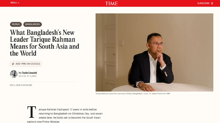 আন্তর্জাতিক প্রভাবশালী গণমাধ্যম টাইম তাদের সাম্প্রতিক এক বিশ্লেষণধর্মী প্রতিবেদনে উল্লেখ করেছে, তারেক রহমানের প্রথম কাজ হবে আইনের শাসন প্রতিষ্ঠা, আর্থিক শৃঙ্খলা ফিরিয়ে আনা এবং জাতীয় ঐক্য নিশ্চিত করা।