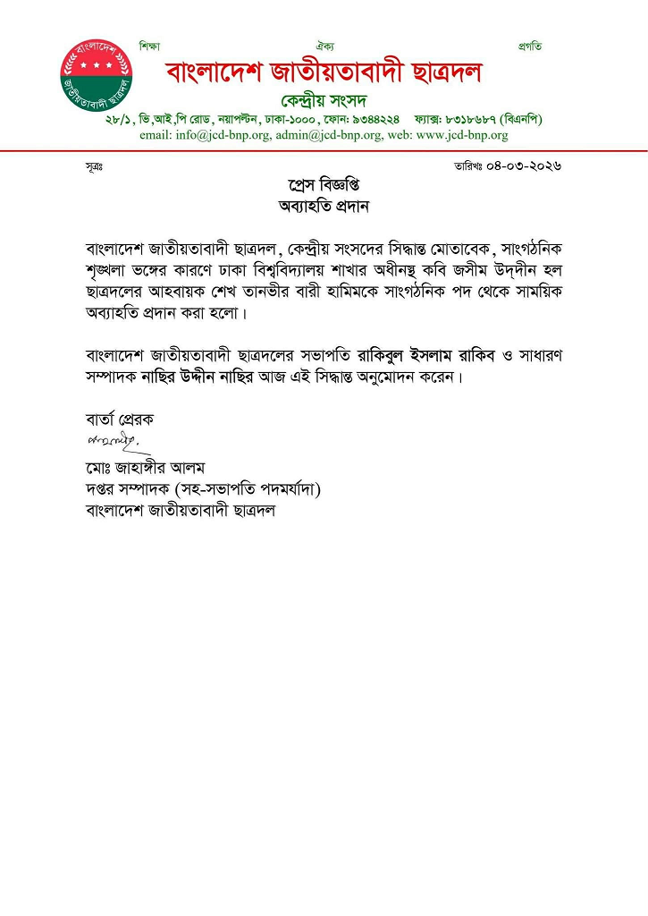 বিজ্ঞপ্তিতে জানানো হয়, কেন্দ্রীয় সংসদের সিদ্ধান্ত অনুযায়ী ঢাকা বিশ্ববিদ্যালয় শাখার অধীন কবি জসীম উদ্দীন হল ছাত্রদলের আহ্বায়ক শেখ তানভীর বারী হামিমকে সাংগঠনিক পদ থেকে সাময়িক অব্যাহতি দেওয়া হয়েছে।