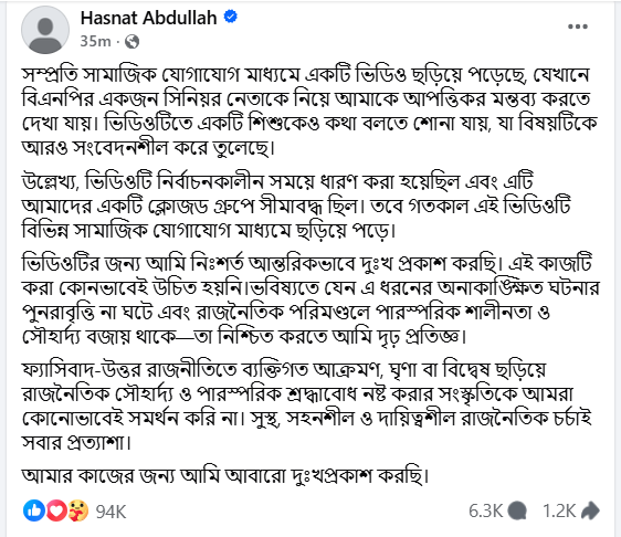 ফেসবুক পোস্টে এমপি হাসনাত আব্দুল্লাহ লিখেছেন, ‘সম্প্রতি সামাজিক যোগাযোগমাধ্যমে একটি ভিডিও ছড়িয়ে পড়েছে, যেখানে বিএনপির একজন সিনিয়র নেতাকে নিয়ে আমাকে আপত্তিকর মন্তব্য করতে দেখা যায়। ভিডিওটিতে একটি শিশুকেও কথা বলতে শোনা যায়, যা বিষয়টিকে আরও সংবেদনশীল করে তুলেছে।’