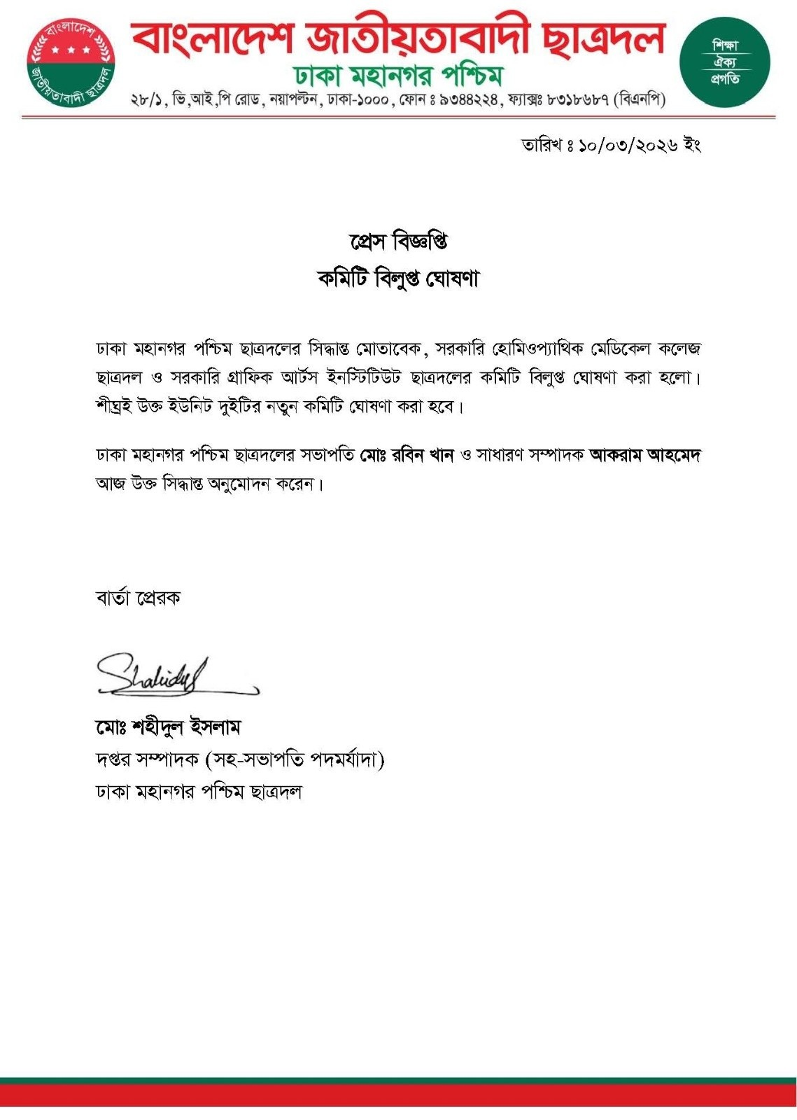 বিজ্ঞপ্তিতে বলা হয়, ঢাকা মহানগর পশ্চিম ছাত্রদলের সিদ্ধান্ত অনুযায়ী সরকারি হোমিওপ্যাথিক মেডিকেল কলেজ ছাত্রদল ও সরকারি গ্রাফিক আর্টস ইনস্টিটিউট ছাত্রদলের কমিটি বিলুপ্ত ঘোষণা করা হয়েছে।