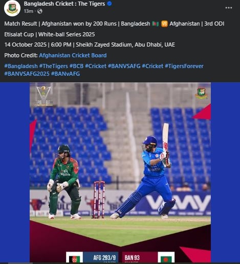 ওয়ানডে সিরিজের তৃতীয় ম্যাচে টানা হেরে হোয়াইটওয়াশ হলো টাইগাররা। ২০০ রানে হারের লজ্জা নিয়ে মাঠ ছাড়তে হলো বাংলাদেশ ক্রিকেট দলকে। আবু ধাবিতে অনুষ্ঠিত আফগানিস্তানের বিপক্ষে ৩ ম্যাচে ২৯৪ রানের লক্ষ্যে খেলতে নেমে মাত্র ৯৩ রানে অলআউট হয় মেহেদি মিরাজের নেতৃত্বধীন দল।