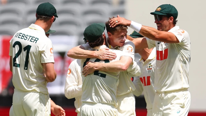 অন্যদিকে, প্রথম ইনিংসেই ব্যাটিং বিপর্যয়ে পড়েছে অস্ট্রেলিয়া। প্রথম দিনের ব্যাটিং শেষে তারা ৯ উইকেট হারিয়ে সংগ্রহ করেছে ১২৩ রান। এদের কেউই ৩০ রানের ঘরে পৌঁছাতে পারেনি। দলের হয়ে রান করেছেন যথাক্রম- অ্যালেক্স ক্যারে ২৬, ক্যামেরন গ্রিন ২৪, ট্রাভিস হেড ২১, অধিনায়ক স্টিভেন স্মিথ ১৭, মিচেল স্টার্ক ১২। অন্যরা কেউ দুই সংখ্যার ঘরে পৌঁছাতে পারেনি।