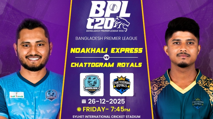 বিপিএলের ১২তম আসরের দ্বিতীয় ম্যাচে মুখোমুখী হতে চলেছে নোয়াখালী এক্সপ্রেস ও চট্টগ্রাম রয়্যালস। শুক্রবার (২৬ ডিসেম্বর) সন্ধ্যা ৭টা ৪৫ মিনিটে সিলেটে শুরু হবে ম্যাচটি।