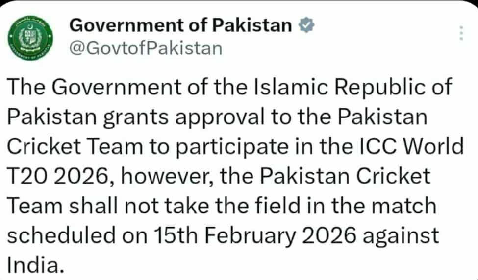 আসন্ন টি-টোয়েন্টি বিশ্বকাপে নিজেদের স্থান পরিষ্কার করলো পাকিস্তান। এবারের টি-টোয়েন্টি বিশ্বকাপ খেলবে পাকিস্তান। তবে বয়কট করেছে ভারতের বিপক্ষে ম্যাচ। রবিবার (১ ফেব্রুয়ারি) এই সিদ্ধান্ত জানিয়েছে পাকিস্তান সরকার।